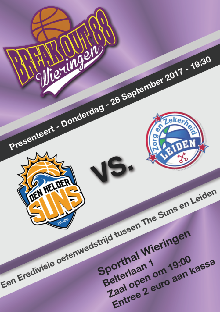 Donderdagavond 28 september om half 8 is er een Eredivisie oefenwedstrijd tussen Den Helder Suns – ZZ Leiden in de sporthal!